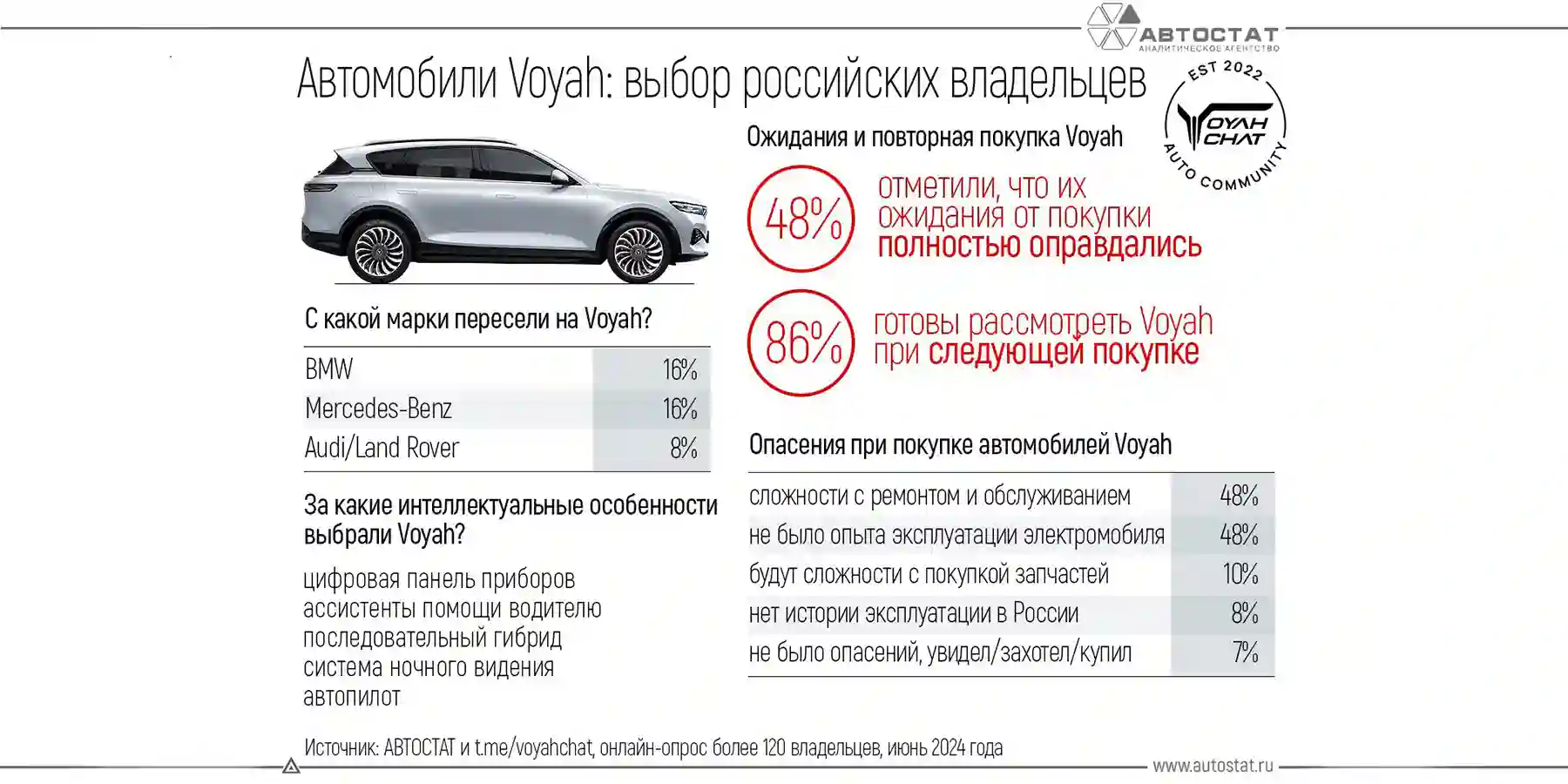 Аналитическое агентство «АВТОСТАТ»1 провело исследование, согласно которому у половины российских владельцев инновационных электромобилей и гибридов VOYAH оправдались ожидания от покупки моделей бренда. При этом, большее число автовладельцев – 86% – заявили о том, что готовы рассмотреть приобретение той или иной модели VOYAH снова при следующей покупке.